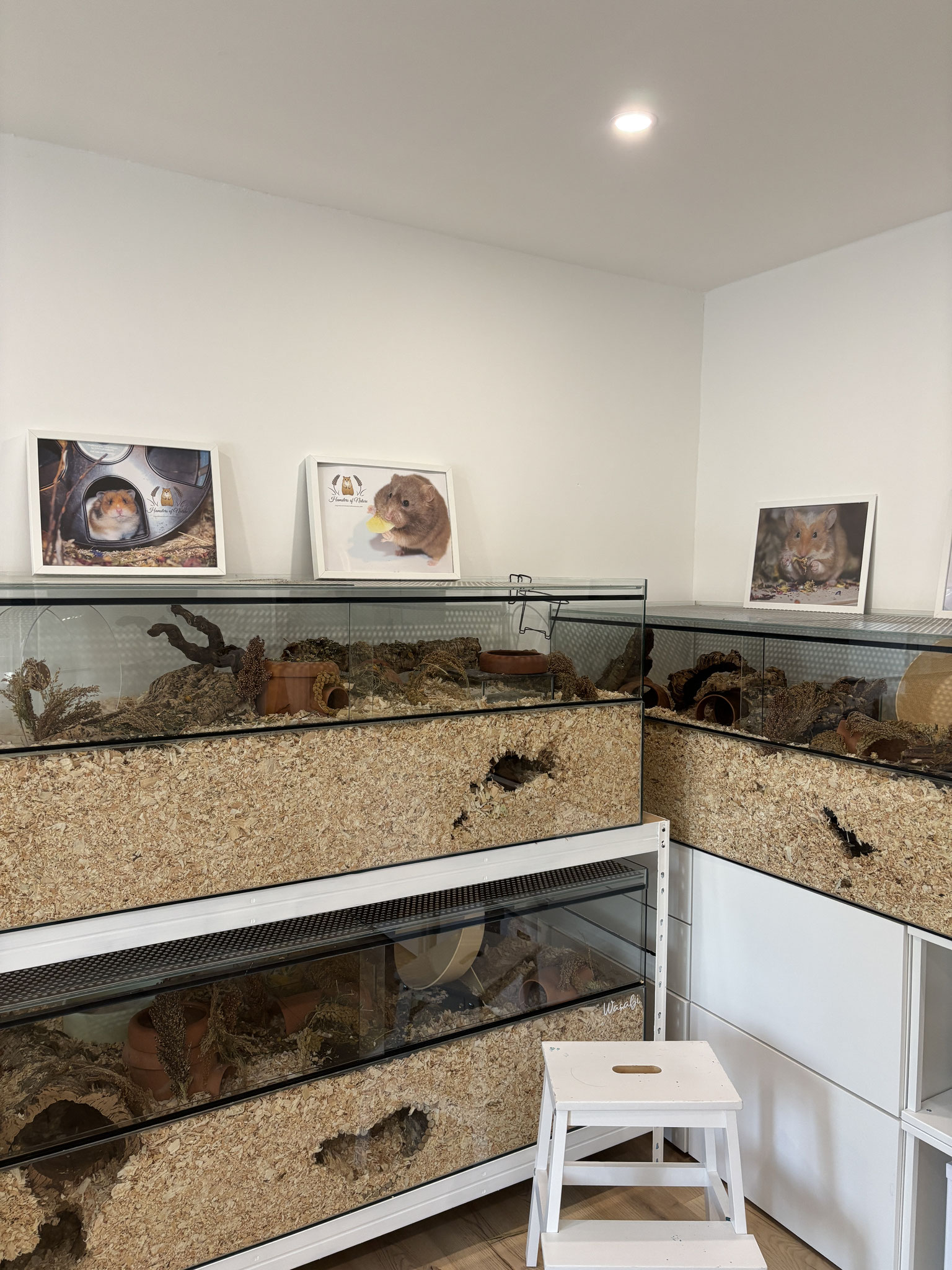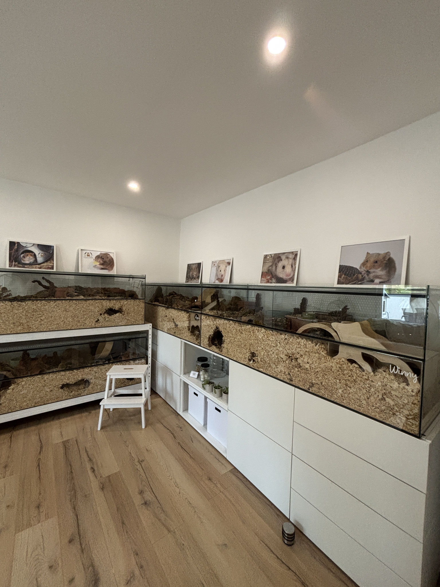 Seit meinem Umzug befindet sich das Hamsterzimmer nun im 1. OG mit viel Tageslicht. Ideal für bioaktive Gehege. Im Zuge des Umzugs haben wir uns nun nicht nur in der Anzahl der Gehege verkleinert sondern auch räumlich. Gleichzeitig sind die Gehege aber größer geworden! :-) Gleich vier 150x60x60cm und zwei 160x60x60cm Gehege wurden 2023 von Glaskörper Hein angefertigt und werden seitdem hier bewohnt. Meine anderen Gehege sind 120x60cm groß.